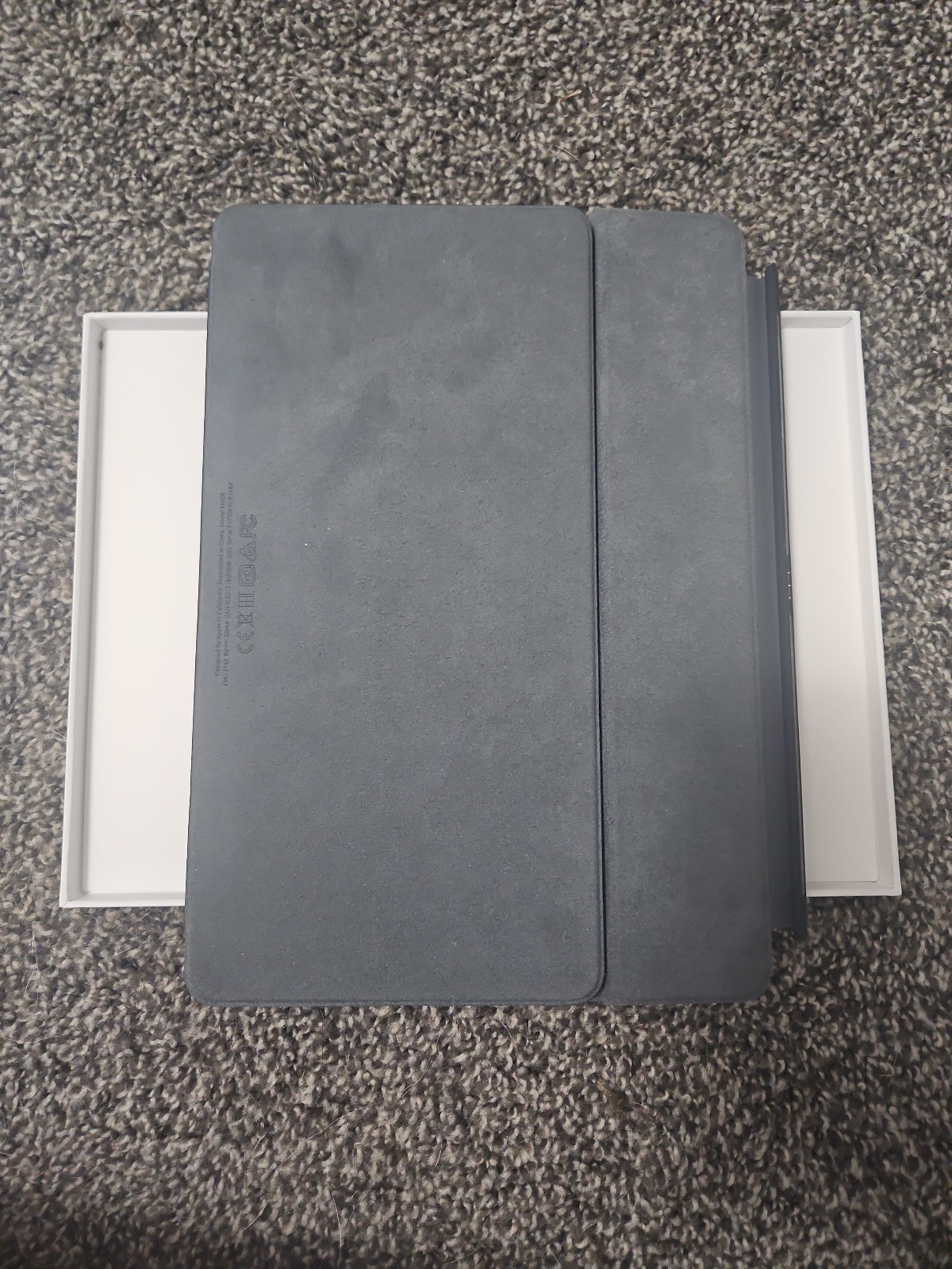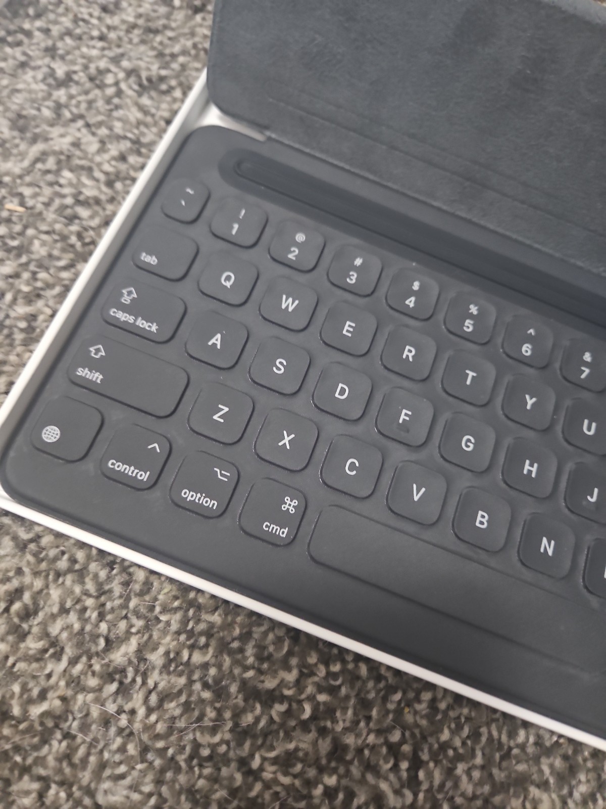 Apple Smart Keyboard iPad, iPad Pro, and iPad Air. The inside is lined with felt. The backing is magnetic and connects to the iPad. Keys work really well, and lettering is still in tact. Comes with box.