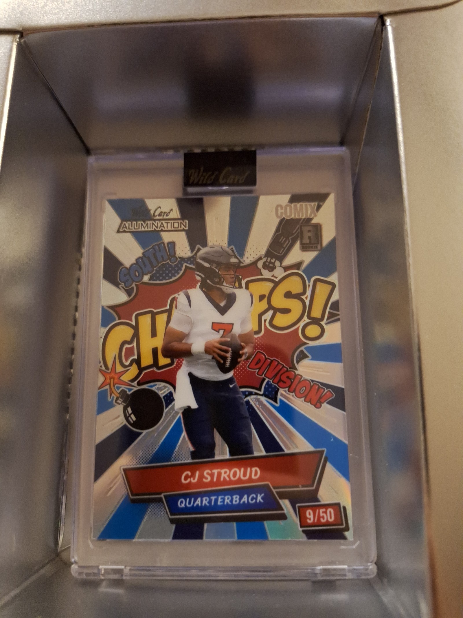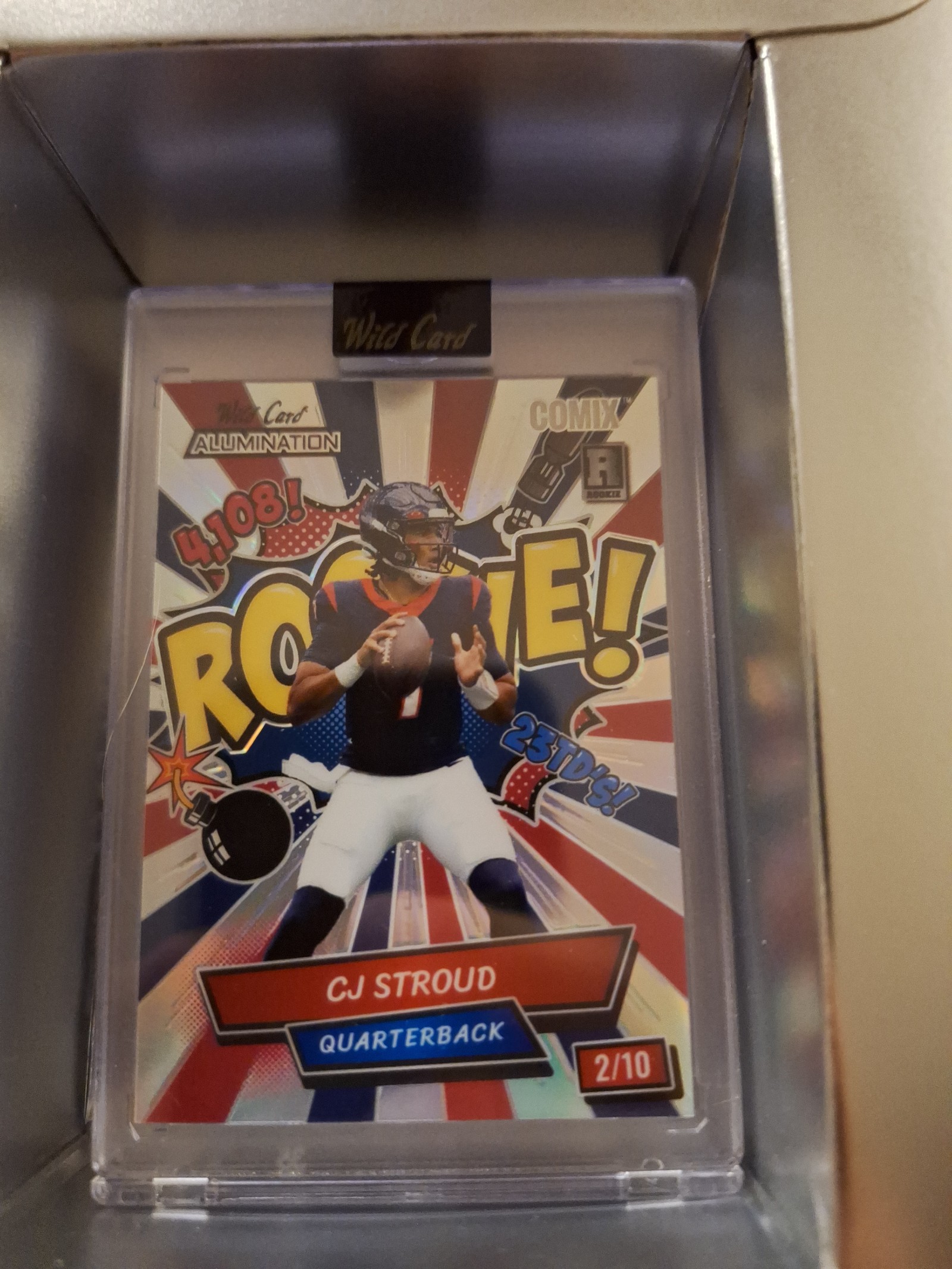 This item is a 2023 limited edition wild card allumination cj stroud box. This box contains 6 numbered cj stroud cards, all numbered and encased and individually foiled wrapped. All of these cards are rookie cards.