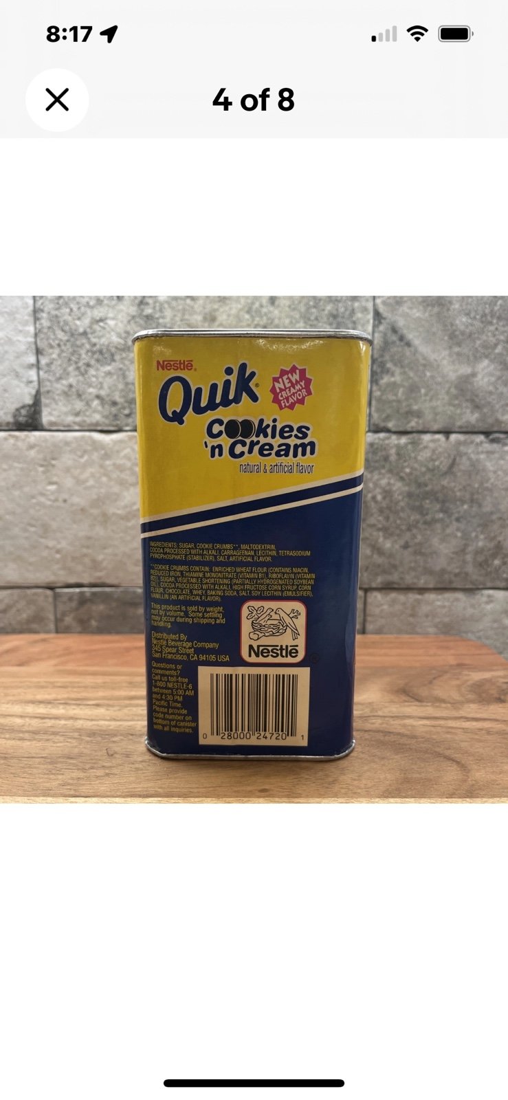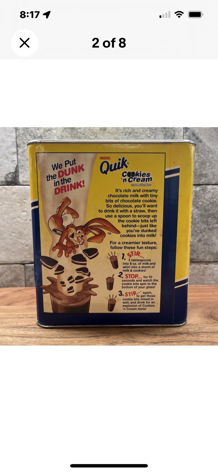 These Vintage Nestle Quik Cookies 'n Cream Tin Cardboard Carton features a cute bunny design and is a nostalgic piece of advertising from the United States. The yellow color adds a vibrant touch to this 26 oz container, making it a unique and eye-catching collectible item for Nestle or Quik fans. Perfect for displaying in a collection or adding a retro touch to any space. Note: Both containers are unopened and in great conditions. One container has a faint crease/line across a small section of front and side panel. The other container has the same crease/line on the back and one side barely visible in the photos. This doesn’t affect the stability, seal or aesthetic of the container. ( Both Containers are unopened)